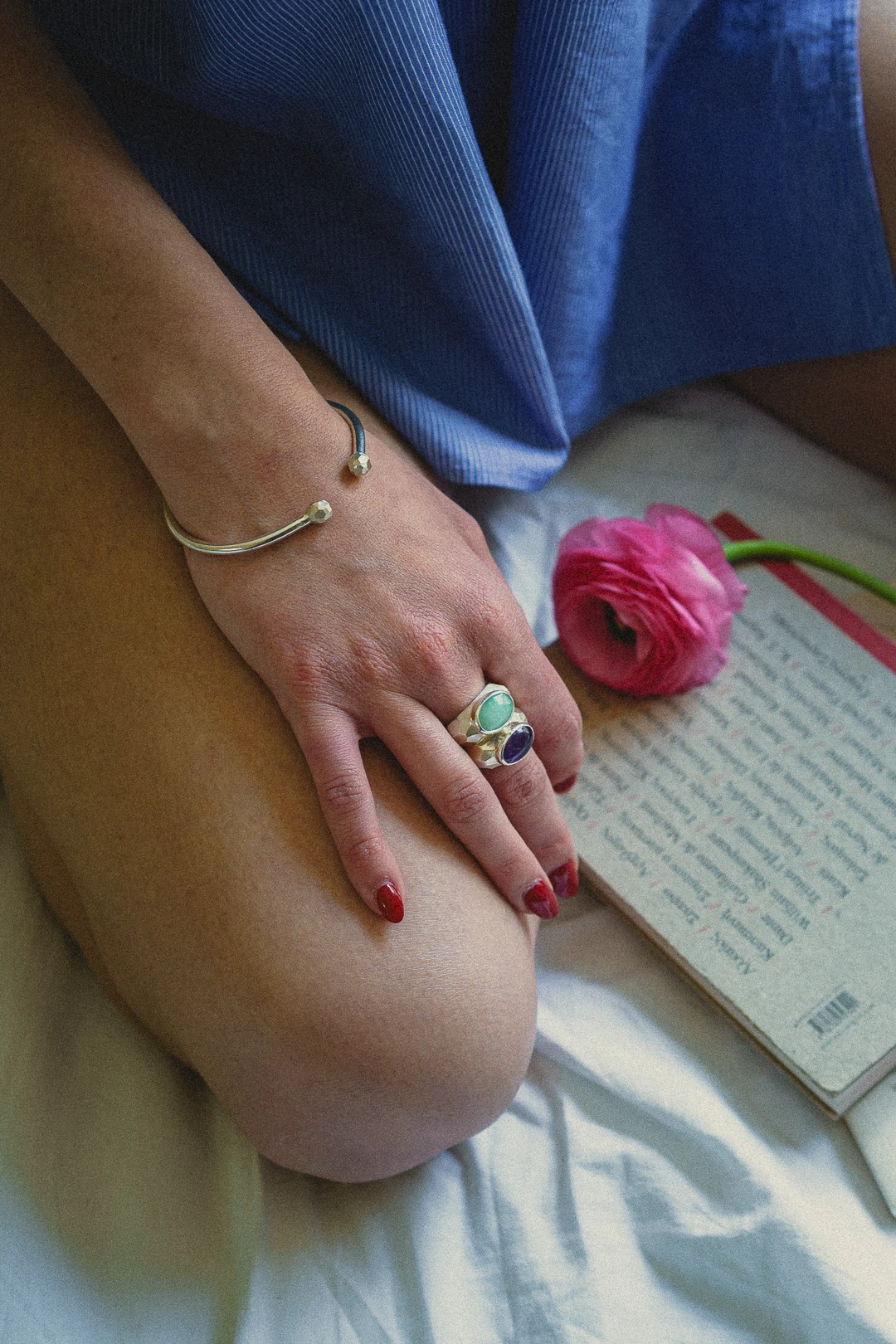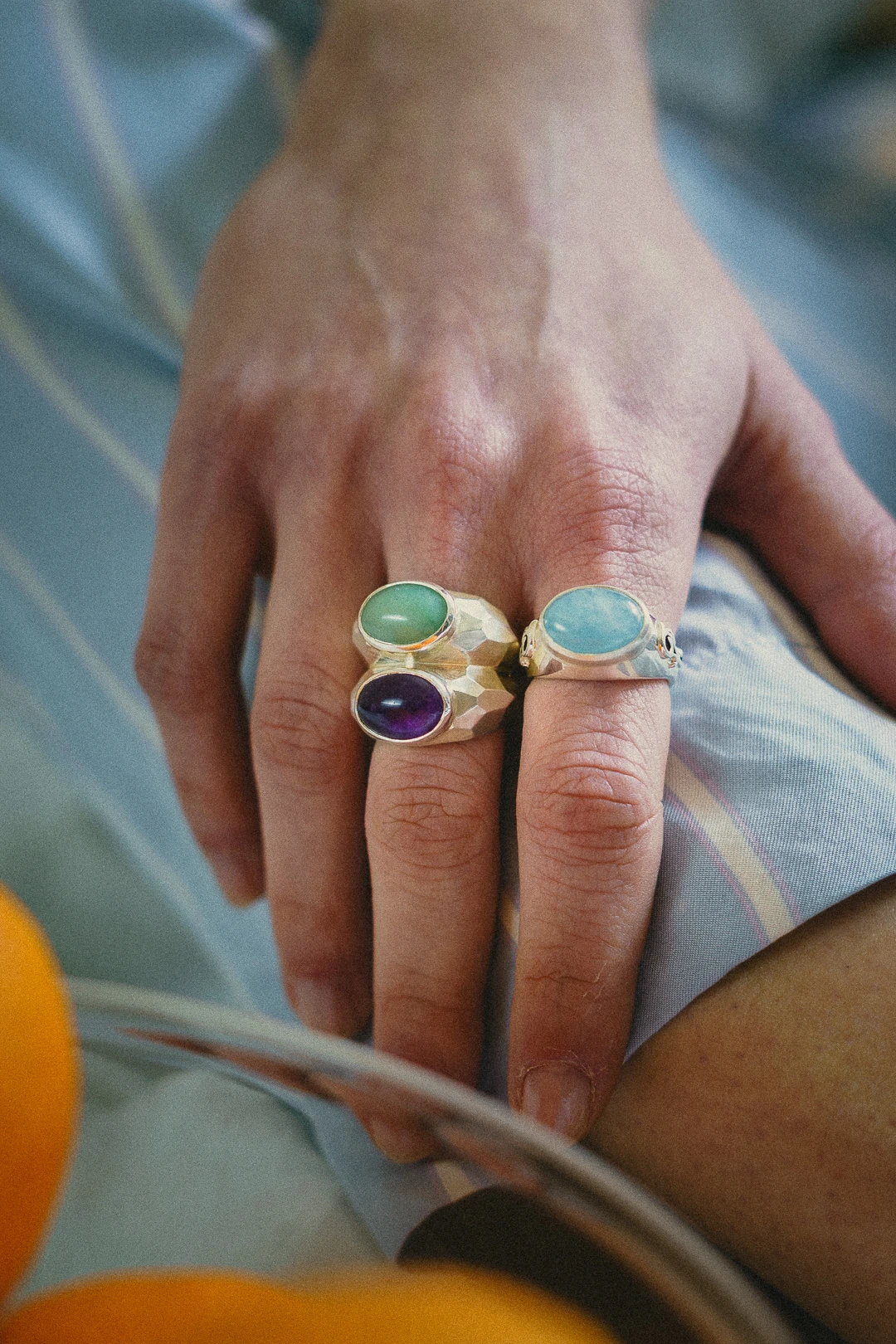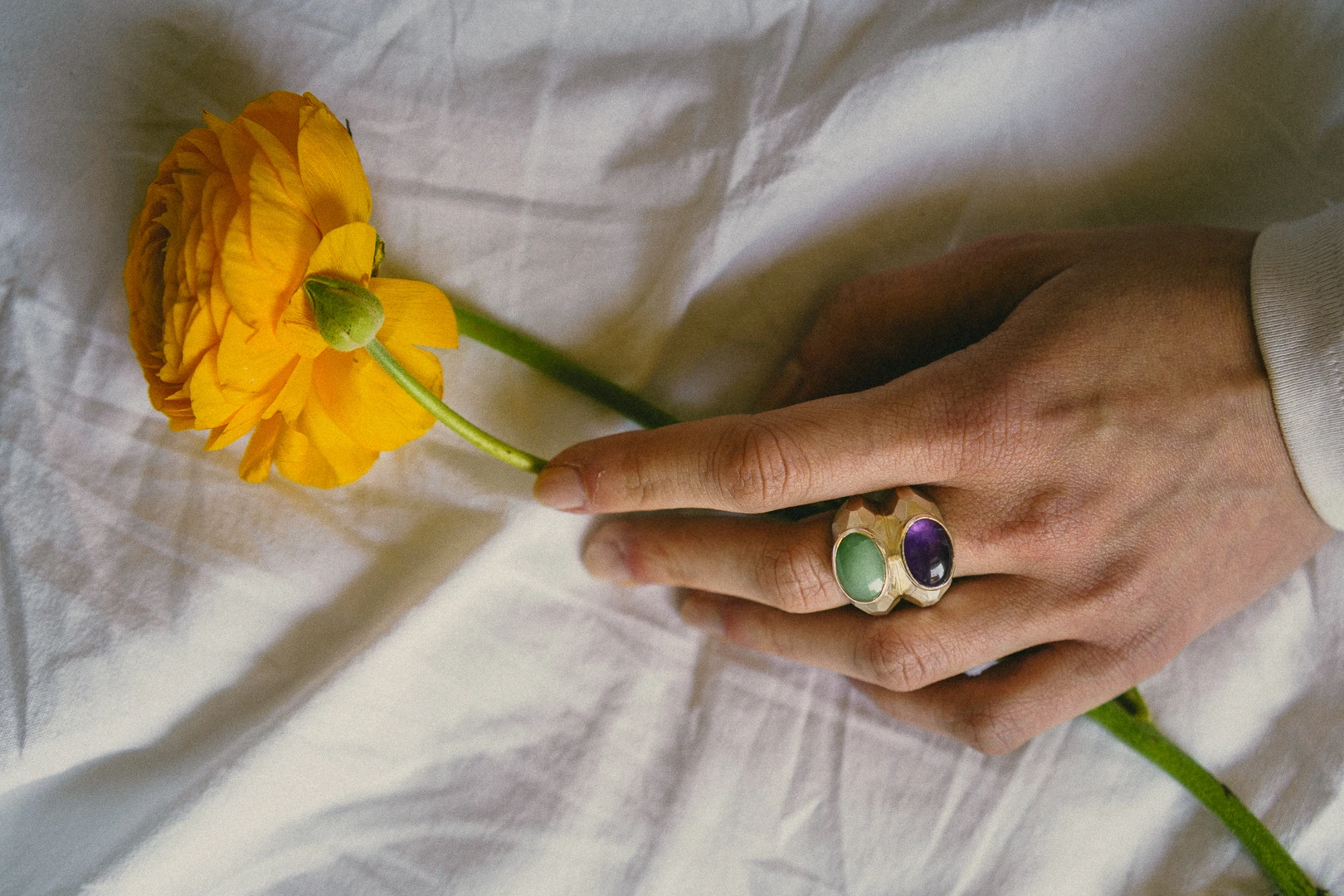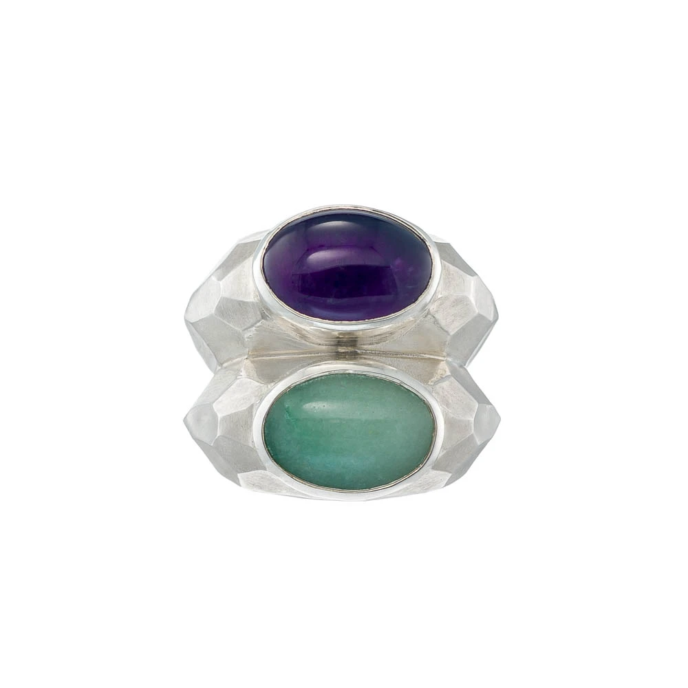 Το Dual Horizon δαχτυλίδι είναι ένα χειροποίητο κόσμημα, το οποίο ανήκει στη συλλογή Fragments of Infinite. Αποτελεί μια ωδή στις ατελείωτες δυνατότητες της φύσης και της δημιουργίας. Ο μυστικιστικός αμέθυστος και ο γαλήνιος αβεντουρίνης συμβολίζουν την ένωση της πνευματικής διαύγειας και της φυσικής ισορροπίας. ενώ οι πολυγωνικές φασέτες του δαχτυλιδιού προσδίδουν μια σχεδόν αρχέγονη ποιότητα. Εμπνευσμένο από τα θραύσματα του απείρου, το σχέδιο αναδεικνύει την ομορφιά μέσα στις φαινομενικές ατέλειες. Είναι ένα κόσμημα που αφηγείται την ιστορία της σύνδεσής μας με το φυσικό κόσμο και μας καλεί να θυμηθούμε ότι κάθε στιγμή, κάθε κομμάτι, αποτελεί μέρος ενός μεγαλύτερου συνόλου. Ένα δαχτυλίδι για όσους βρίσκουν την ομορφιά στην ουσία και το μεγαλείο στις λεπτομέρειες.