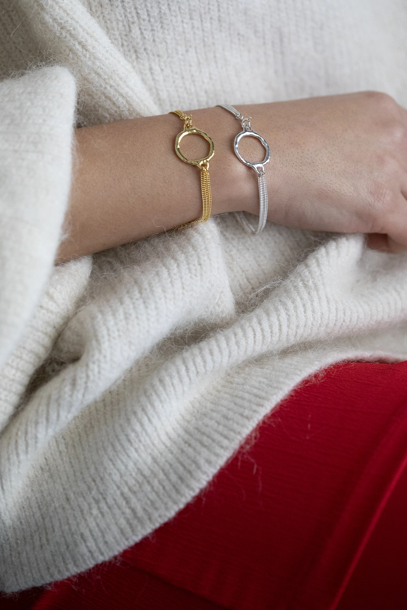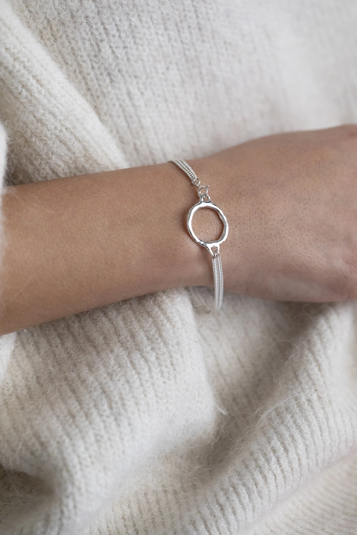 Στο κέντρο του Ember βραχιολιού, ένα γλυπτικό ασημένιο στοιχείο μοιάζει με μικρό ουράνιο σώμα που παγιδεύει το φως στην επιφάνειά του. Από αυτό ξεκινούν τρεις λεπτές αλυσίδες, σαν παράλληλες τροχιές που το κρατούν σε αιώρηση μέσα στο κενό. Η μορφή του, οργανική και μεταλλική, θυμίζει πλανήτη που γεννήθηκε από λιωμένο μέταλλο και στάχτη άστρων. Λιτό αλλά φορτισμένο με κοσμική ενέργεια, το κολιέ αποτυπώνει τη στιγμή όπου ένα νέο σύμπαν διαγράφει την πρώτη του κίνηση.